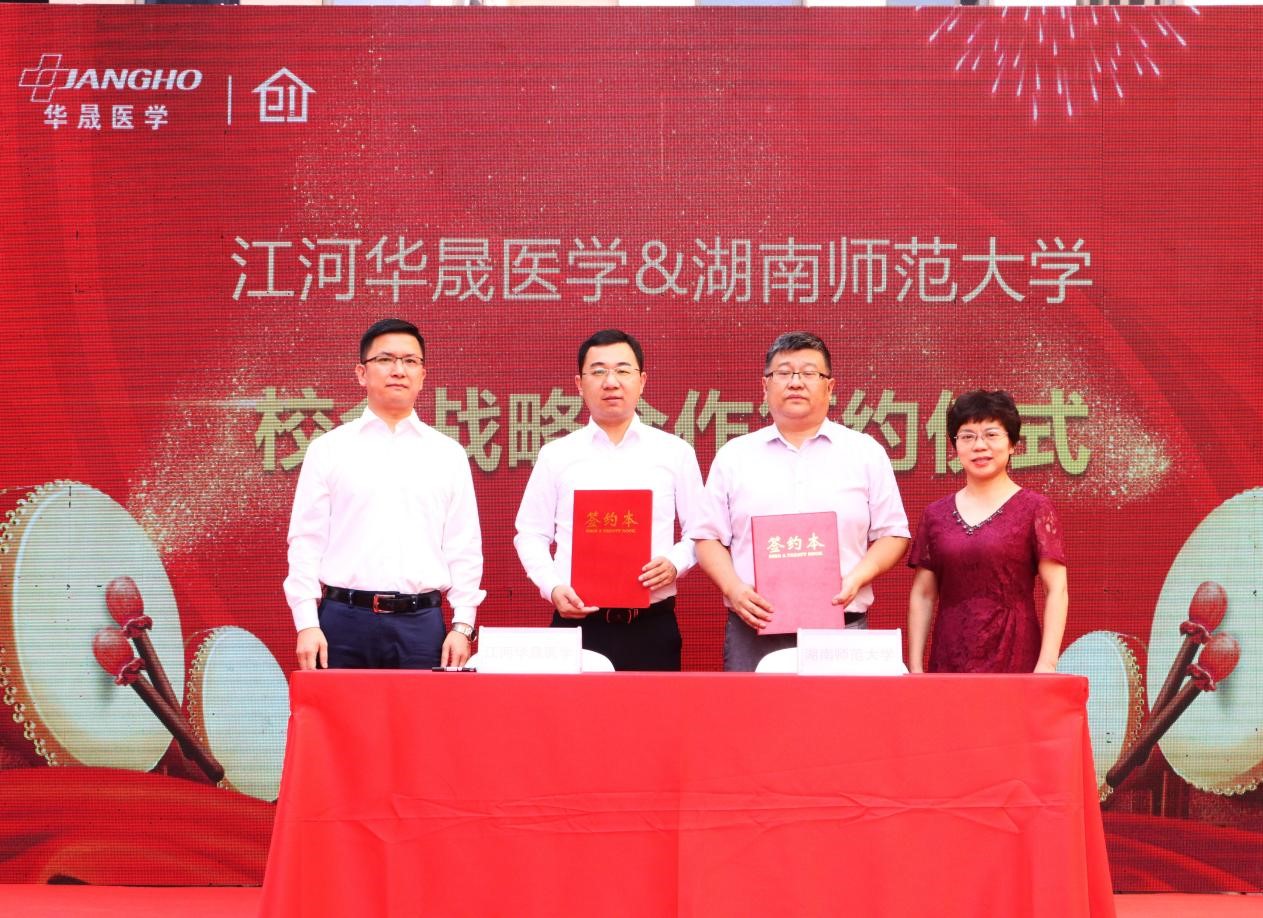 我院党委副书记陈松、江河华晟医学高级副总裁肖白桦正式签署战略合作协议。我院党委书记鄢朝晖、江河华晟医学总经理陈孔维上台观礼,共同见证了我院和江河华晟医学缔结的合作情谊。双方将以合作签约为契机,发挥各自优势,在大学生创业创新、人才培养模式升级、产学研成果转化等多个领域,开展更加深入而全面的合作,共赢美好未来。