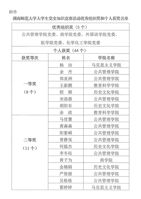 为庆祝中国共产党成立100周年,根据省委教育工委《关于开展湖南省大学生党史知识党赛的通知》精神和《中共qm球盟会官方网站委员会关于开展党史学习教育的实施方案》的部署安排,学校开展了大学生党史知识竞赛活动。根据报名参与人数、竞赛成绩等综合情况,公共管理学院党委等5个二级党组织获评优秀组织奖。通过笔试和面试两个阶股,个人奖项共决出一等奖8个、二等奖11个、三等奖25个。我院党委荣获优秀组织奖。