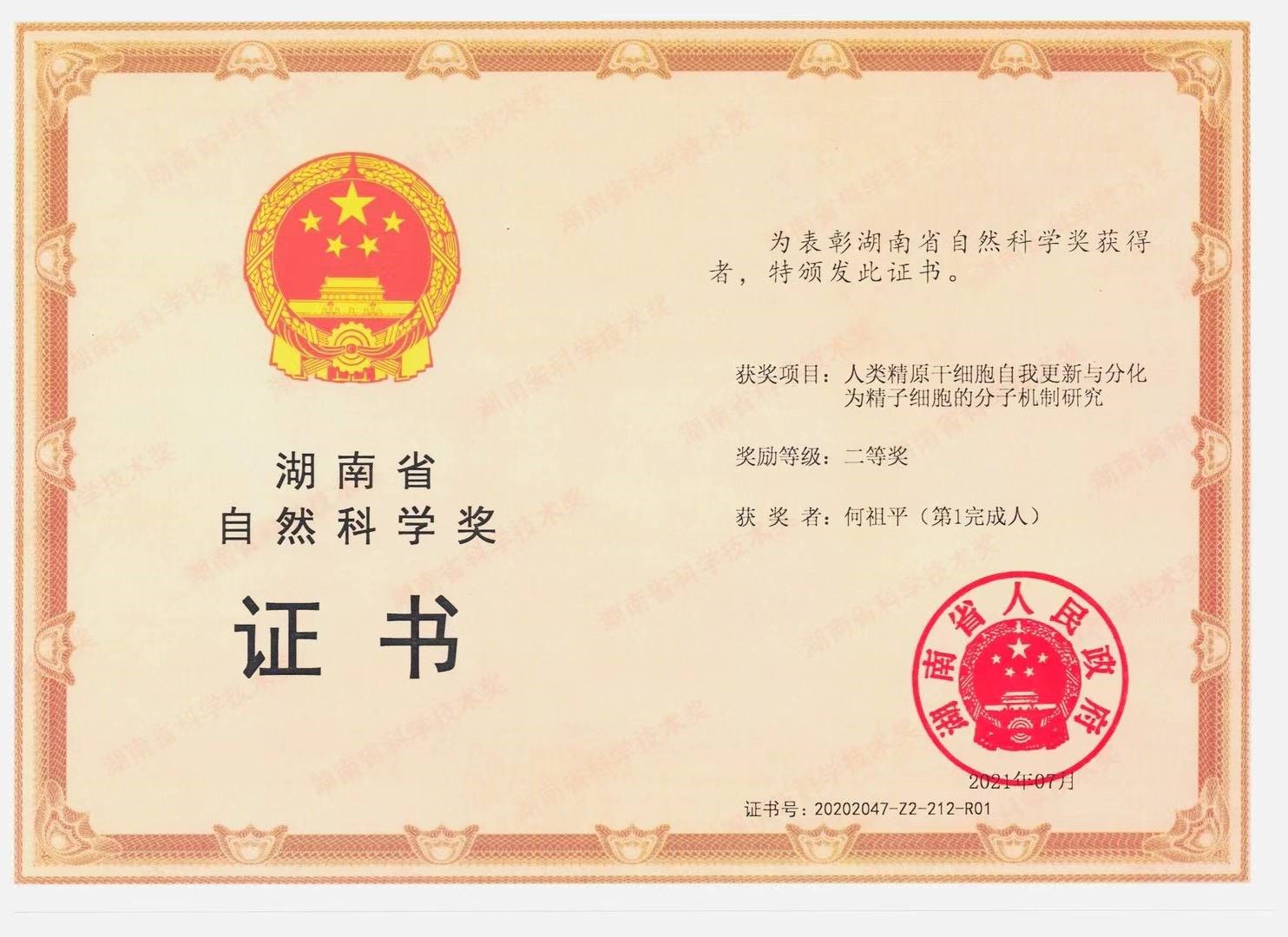 湖南省科学技术奖励由湖南省人民政府设立,旨在奖励在科学技术进步活动中做出突出贡献的省内公民和组织。何祖平教授长期从事生殖干细胞的基础研究与转化应用,率先构建体外三维培养体系,诱导人类精原干细胞体外分化为具有受精和发育功能的精子细胞,为无精症病人提供种子细胞;首次探讨PAK1基因和P63基因突变与非编码小RNA调控人精原干细胞自我更新与分化为精子细胞的作用及其靶标,为理解人类精子发生的机制提供新的遗传与表观遗传调控机理;比较正常与男性不育病人精原细胞、粗线期精母细胞、圆形精子的miRNA大规模差异表达谱,发现这些差异表达miRNA的靶基因,为人类精子发生障碍提供新的致病机制。这些研究成果发表在国际权威期Cell Death and Differentiation、Molecular Therapy-Nucleic Acids、Cell Death and Disease。此次获奖的科研成果为男性生殖细胞发育及异常提供新的遗传与表观遗传调控机理,对治疗男性不育症、预防子代缺陷、促进社会和谐有重要意义。