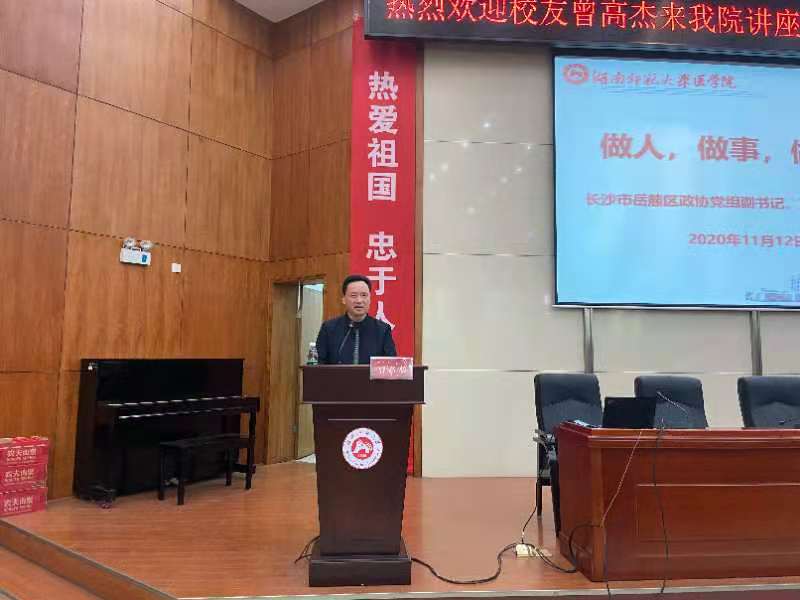 11月12日下午,在我院学术报告厅,长沙市岳麓区政协党组副书记、副主席曾高杰为我院师生带来一场“做人、做事、做学问”主题讲座。我院全体行政管理人员和教辅人员、青年教工党员、全体研究生及本科生班干部聆听讲座,院长何祖平、副院长邓文艳、党委副书记陈松参会,院党委书记鄢朝晖主持讲座。