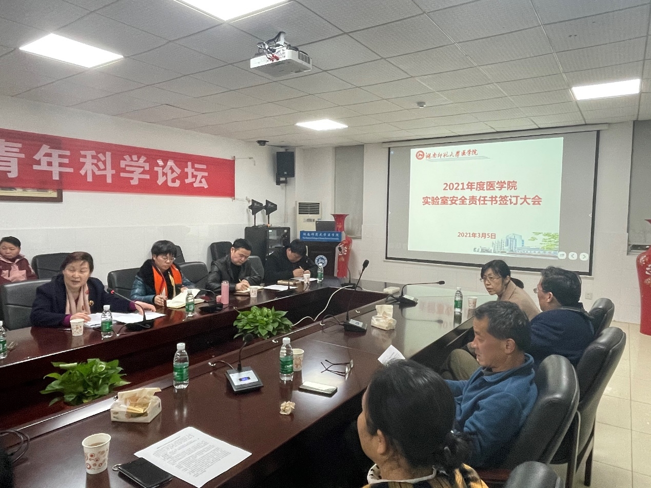 2021年3月5日,我院在仁医楼207会议室召开我院2021年度实验室安全责任书签订大会,会议由医药学实验管理中心主任余星主持,院党委书记鄢朝晖,副院长张坚松、邓文艳出席会议,中心全体员工参加了会议。