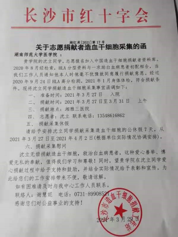 沈立同学为2016级预防班的优秀学子,他是一名中共党员,担任支部支委、年级团支部副书记及班团支书。早在2018年,沈立同学志愿报名加入了中国造血干细胞捐献者资料库。2020年10月得知与一白血病患者初配成功后,他毫不犹豫并默默地开始了履行捐献意愿的一系列配合工作。直到2021年3月我院收到来自长沙市红十字会的告知与表扬函,老师和同学们才发现这位优秀的同学一直在默默的奉献为人,用自己的青春支持国家公益事业。
