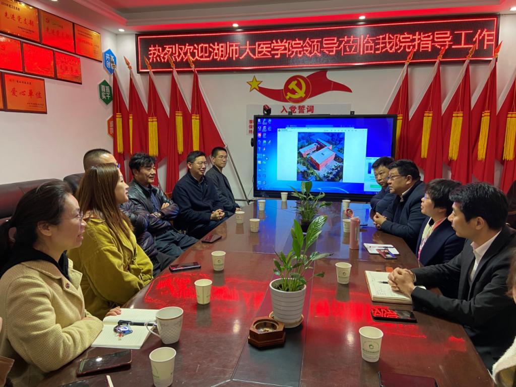 4月2日上午,我院党委书记鄢朝晖一行6人赴湘乡市尚如湖铁医院参观考察。我院党委副书记陈松、临床医学系李玉飞教授、我校校友、湖南医药公司总经理仇建波等陪同考察。