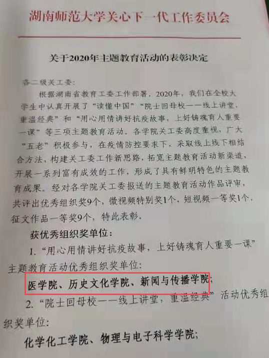 2020年,为深入学习贯彻习近平新时代中国特色社会主义思想,不断加强“四史教育”,强化青年担当,促进学生成才,我校关心下一代工作委员会在全校范围内开展“读懂中国”“用心用情讲好抗疫故事、上好铸魂育人重要一课”和“院士回母校--线上讲堂,重温经典”等三项主题教育活动。