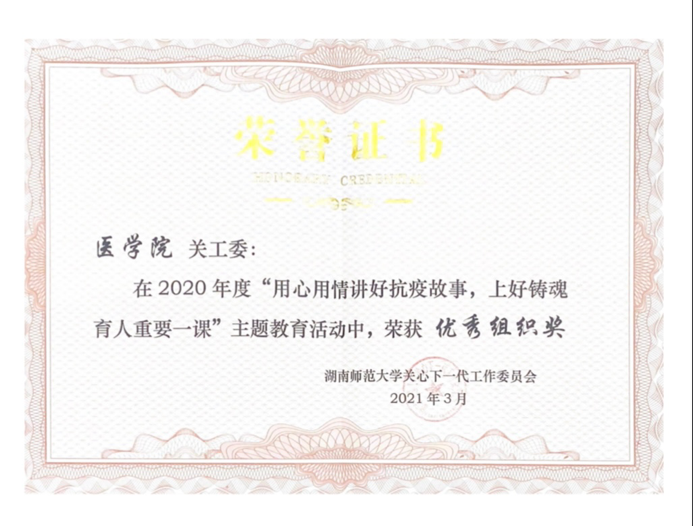 本次主题教育活动受到学校关工委领导的特别关注,校关工委常务副主任徐书华、副主任兼秘书长何国萍、副主任李再民等多次赴我院指导关工委工作。在学校关工委的指导下,我院采取线上线下相结合的方式,通过树立优秀的校友榜样,加深了同学们对“生命至上,举国同心,舍生忘死,尊重科学,命运与共”抗疫精神的理解,培养学生的爱国主义精神,激励广大我院学子不断拼搏奋进,不忘初心,牢记使命,为医学奉献青春和力量。