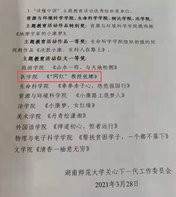 我院关心下一代工作委员会高度重视此次活动,鼓励学生积极参与,并取得了优异的成绩。在“用心用情讲好抗疫故事,上好铸魂育人重要一课”活动中,我院关心下一代工作委员会获优秀组织单位奖;在“读懂中国”主题教育活动中,我院《“网红”教授张娜》一文获得征文一等奖。在qm球盟会官方网站2021年关心下一代工作会议上,我院关心下一代工作委员会被评为“关工委工作活动立项”的合格项