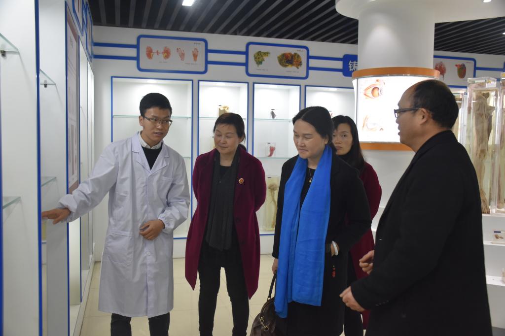 4月14 日,长沙市科技局副局长陶红、政法处处长左列、副处长蒋万知等一行赴我院考察人体形态学科教馆建设情况,我院副院长邓文艳、医药学实验管理中心主任余星、科技处科长李文凯等陪同考察。陶虹一行认真参观了人体形态学科教馆,听取了科教馆建设和开放等方面情况汇报,对精心打造的科教馆称赞有佳。专家们建议成立专业的科普团队,将人体形态学科教馆的宣传活动带进社区,面向大众,将解剖学与临床知识相结合,在科普的过程中传播预防疾病的理念。希望在人体形态学科教馆的公众号“数字化人体解剖学科教馆”中开放预约通道,将科教馆进一步建设成既有医学教育意义、又能面向社会大众的科普基地。