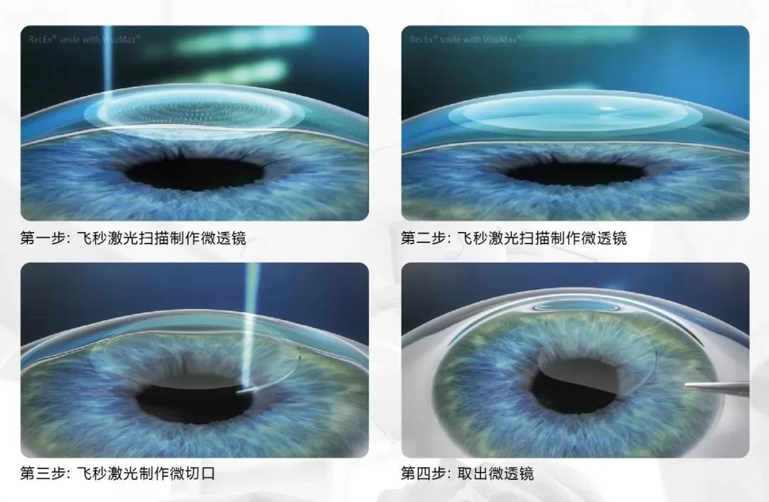 全飞秒手术是一种微创手术,适合100至1000度的近视患者,要求散光度数在500度以内[3]。首先仅使用飞秒激光,在角膜基质层内“雕刻” 出一个类似近视度数的透镜,然后在角膜边缘开一个 2-4mm 的微小切口,之后,将雕刻好的透镜完整取出,无需缝合,切口会自行闭合,角膜表面保持完整[4]。相比半飞秒手术,全飞秒手术创口小、恢复快、无角膜瓣相关风险,术后出现干眼症概率较低。