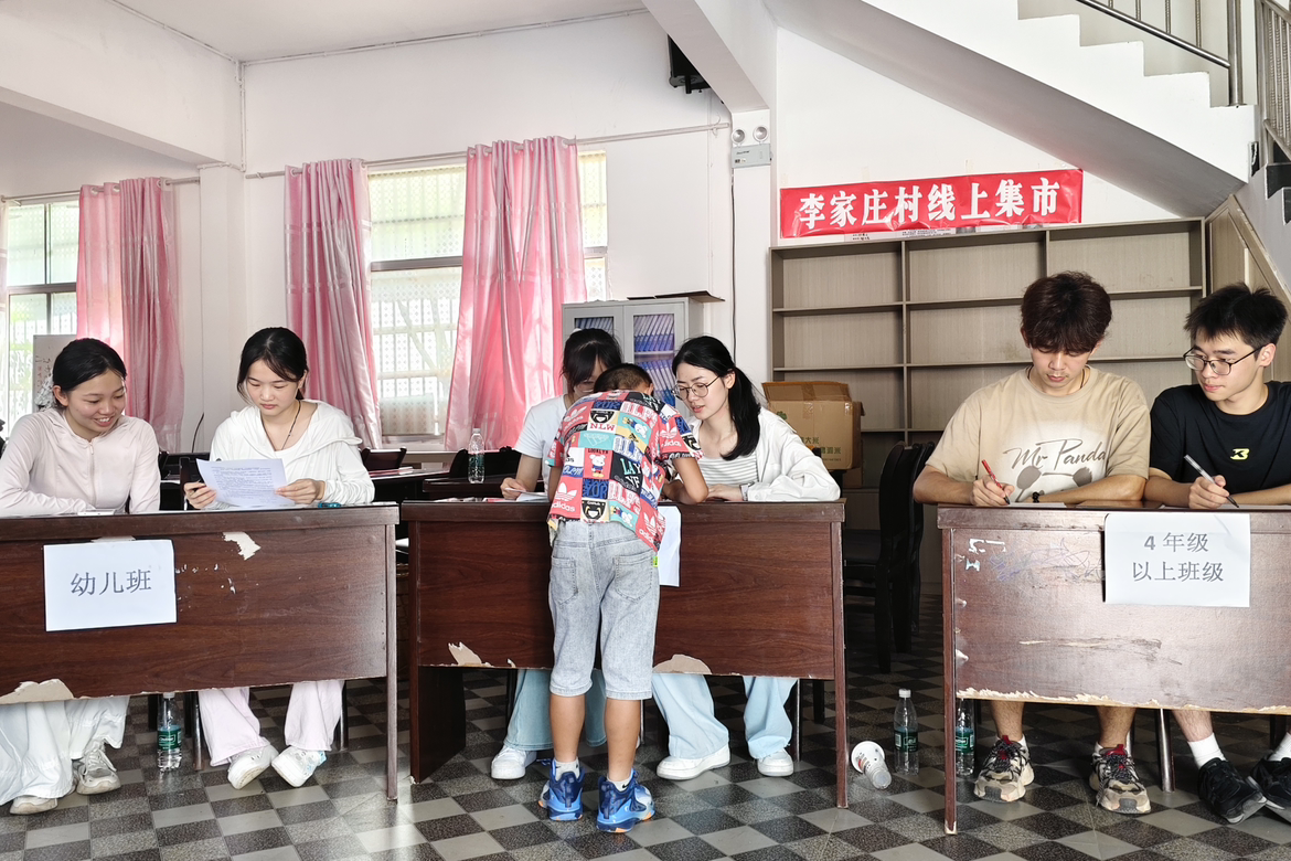 活动伊始,支教团四位成员分为三组,依次负责幼儿、低年级、高年级三个年龄段的招生工作。此外,为了保障学生安全,实践团安排了两名成员维持现场秩序。支教组成员带领孩子们完成了报名并填写了安全责任书。为贴合不同年龄段学生认知特点与学习需求,支教组针对性地设计了差异化教学内容。针对幼儿段设计趣味运动和练字,培养反应力与专注力;低年级侧重基础巩固与兴趣引导;高年级则增设知识拓展与实践体验课,帮助每个阶段的学生在适配的教学中收获成长。除开设特色课程以外,实践团还设置了作业辅导板块,帮助当地留守儿童更好地完成课业。