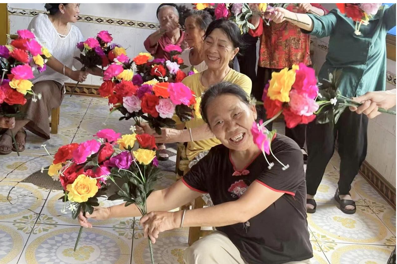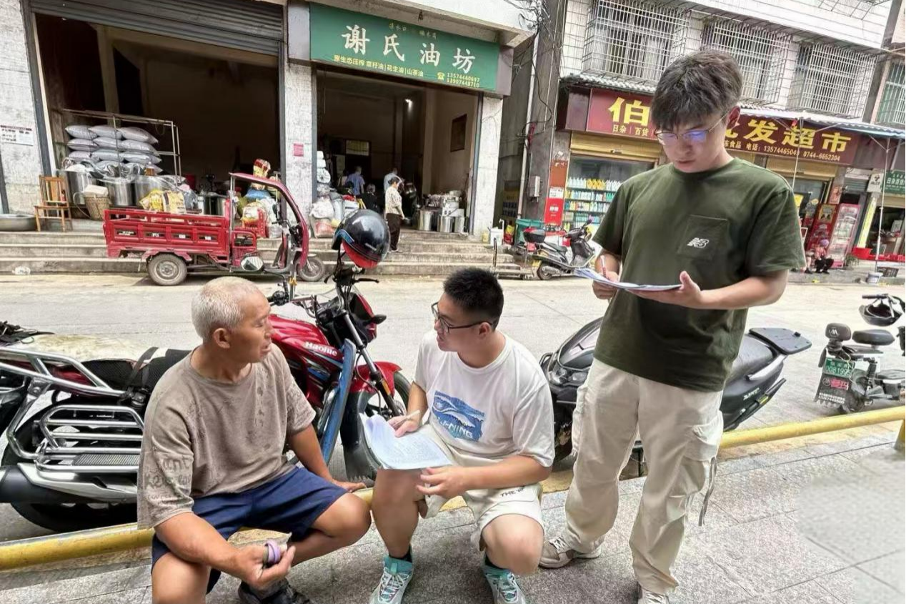 调研期间,实践团成员分为两组,在当地集市、街道等人员密集区域,针对不同年龄段、职业背景的核心人群开展访谈,并发放调查问卷。在调查过程中,调研组组长邓鑫与楠木岗社区党总支书记杜桂月交流,了解凉水口镇在桑植民歌传承、民歌团建设等方面的相关举措。在杜桂月书记的带领下,全体成员前往当地农村幸福院,现场观看桑植民歌团的专场演出。民歌团表演了3个桑植民歌节目,现场氛围融洽。