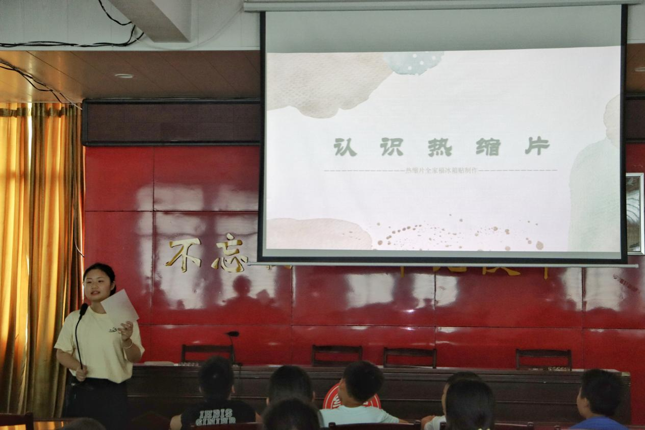 课程开始前,实践团成员准备了热缩片基本材料:透明塑料片、热风枪等。课程伊始,主讲成员向学生介绍了热缩片的基本物理特性,即受热后会发生面积收缩、厚度增加并硬化的现象,并讲解了操作步骤和安全注意事项。