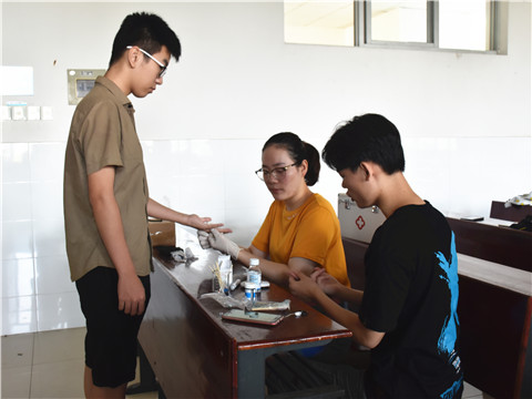上午,健康咨询组围绕血型血糖血压的测量展开培训,手把手教队员怎样挤血才能取得合适的血量并减轻疼痛感,以及减少感染病菌几率的方法,为提高助手和主针者的默契,助手与主针者多次练习流程,被测者也积极配合操作者要求。血型测量所需血量更大,因此挤血时注意事项更多,测量血型的重点是如何滴加抗A、B凝集素并由反应现象判断血型。在血压测量培训中,手测肱动脉明显的搏动点,在嘈杂的环境中准确判断脉搏跳动的声音是难点,队员们也围绕这两点不断训练。