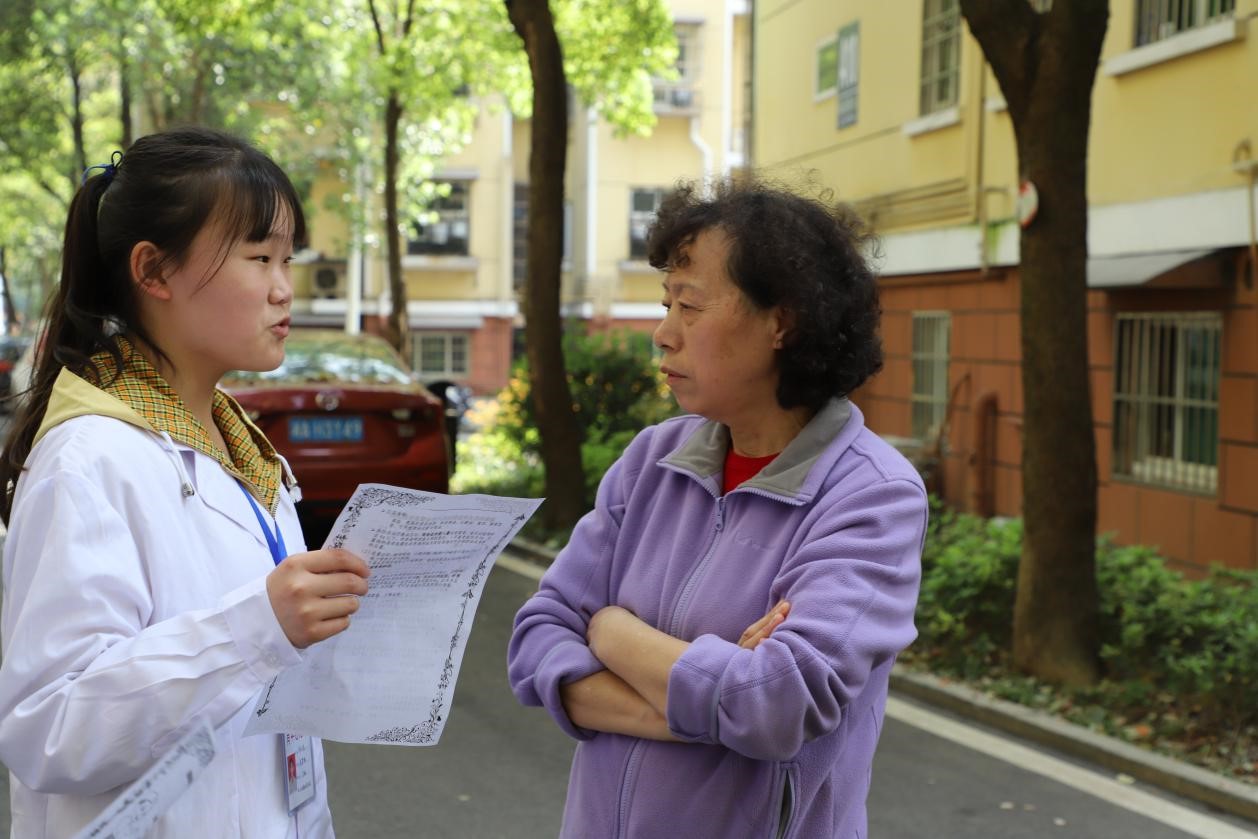 在社区中,志愿者们分散开来,发放健康咨询单,并将有需求测量血压、血糖或血型的老人引导至摆点处。老人在测血糖血压的过程中,健康咨询队队员会询问老人年龄等进行登记,并介绍在不同情况下的血压血糖正常范围。健康咨询队队员参考测量结果,针对高血糖的老人,建议少吃一些血糖值偏高的食物等,对于高血压的老人,应合理膳食、不能随意停药等。而测量血型的老人大多是对自己的血型不清楚,健康咨询队便帮助老人得到答案。