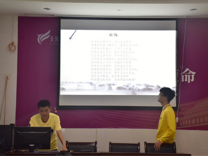 在社区会议厅里,孩子们观看志愿者事先准备好的PPT,其主要分为四个内容:屈原生平简介、屈原代表作展示、端午节由来和《离骚》(节选)赏析。活动中,孩子们对端午节的由来产生共鸣,并对屈原深厚的爱国情感十分崇敬,表示要努力学习,向他看齐。志愿者带领孩子们朗诵《离骚》一文时,对于一些生僻字,孩子们虚心请教,赏析诗句时,他们跟随志愿者遨游于作者高洁的精神世界,活动结束后,他们咬字清晰,读起来朗朗上口,学到人生路曲折且漫长,但为了追求真理,应不屈不挠、勇往直前的道理。