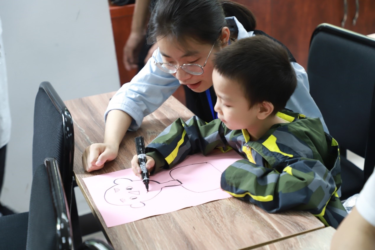 在绘画的过程中,志愿者帮助孩子将自己想象的场景画在纸上,带领孩子们去关注各种绘画元素之间的大小比例和色彩搭配,并时刻注意孩子们的安全,教会孩子们如何安全地使用画笔和剪刀等工具。在志愿者的照顾下,孩子们最终完成了自己的作品,并积极地向老师和家长展示、讲解。