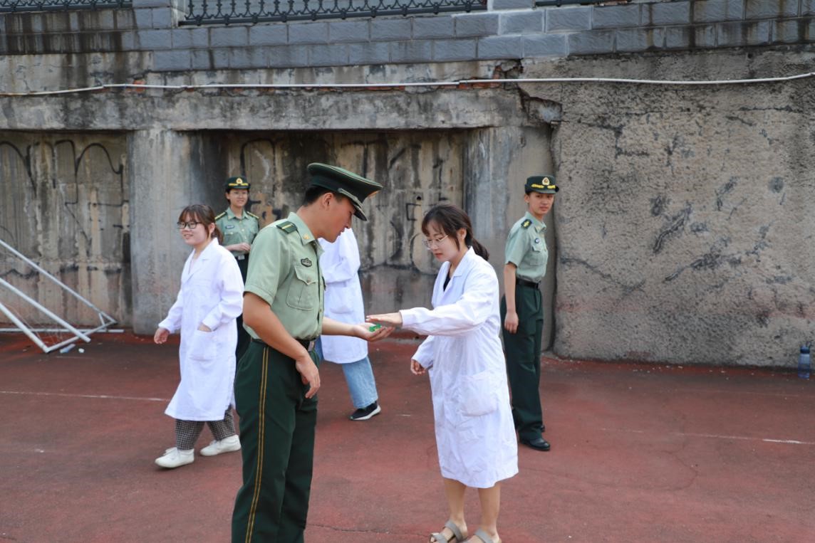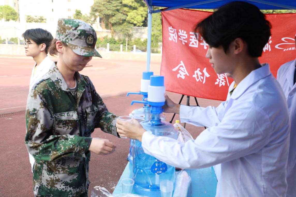 志愿者在田径场入口处摆放帐篷,为军训新生提供一些医疗方面的援助。新生们可以在训练休息时来喝一些淡盐水和葡萄糖水补充体力,对于在训练时出现轻度不适症状的同学,志愿者会提供云南白药、人丹、藿香正气水、感冒灵等基础药物为中暑、受伤、肚子痛和感冒的同学提供帮助。对于抽筋和晒伤的同学,志愿者也会在进行简单处理后视情况送去医务室进行进一步的治疗。